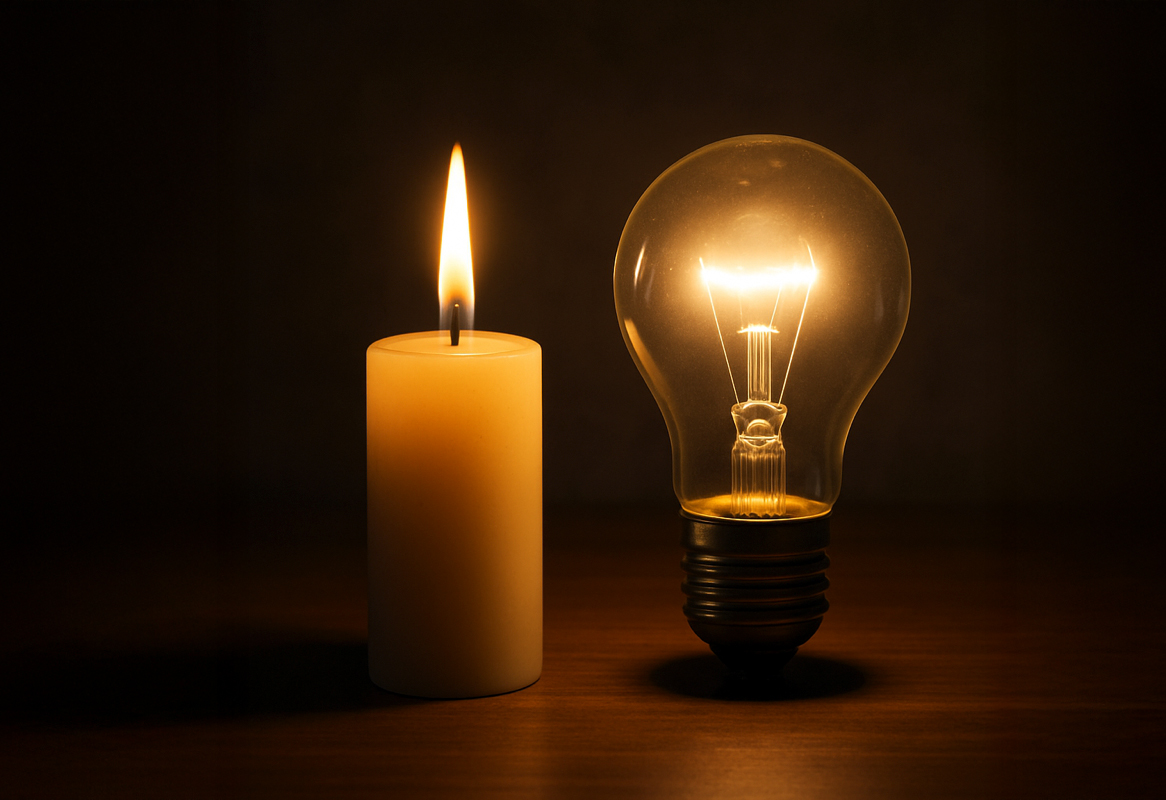 Ilustración: “The electric light did not come from the continuous improvement of candles.” — afirmación atribuida a Oren Harari
