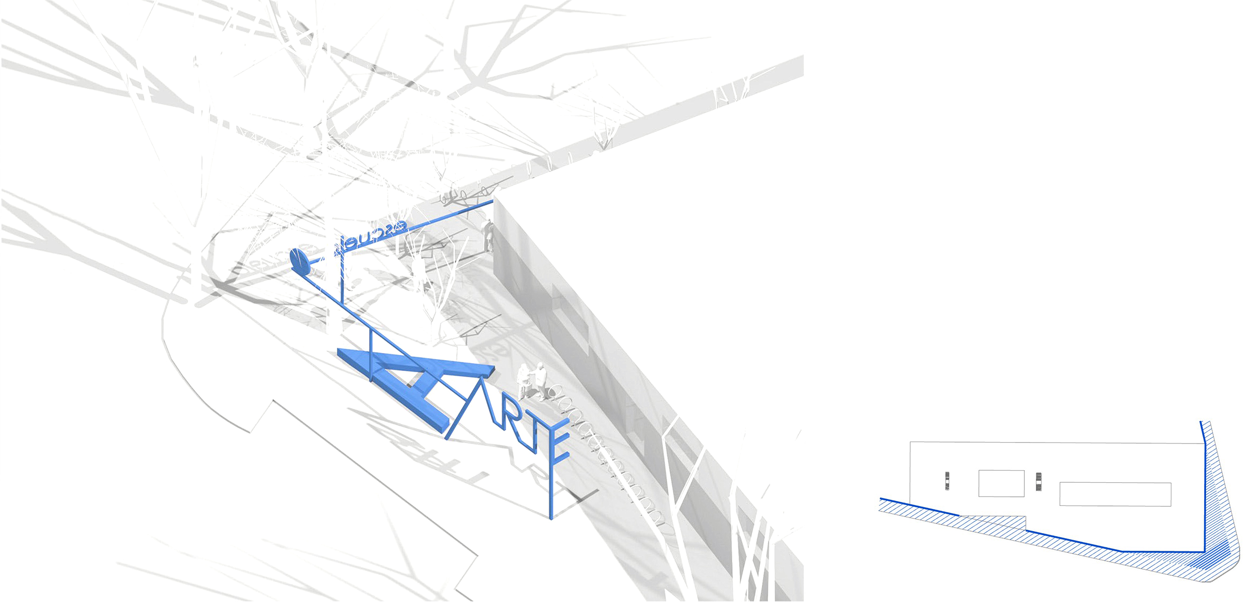 «Taking advantage of the location of the building in relation to the urban fabric, a small welcoming square is gifted to the city. This creates a meeting space for young people, but also for the citizens. The small square, with oversized letters forming the ART sign, will allow the students to sit down to chat, eat a sandwich or have fun. Given its location in the street, it becomes part of the public space, activating the architecture. The building configures a background, and the students themselves the activity that will act as claim for the rest of the city.»